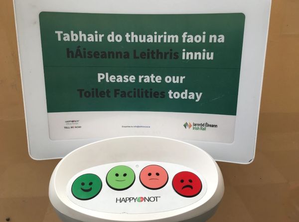 In this challenge, you will work with an Irish facility feedback design, where users are asked to rate a train station bathroom. What changes would you make to IMPROVE the design?